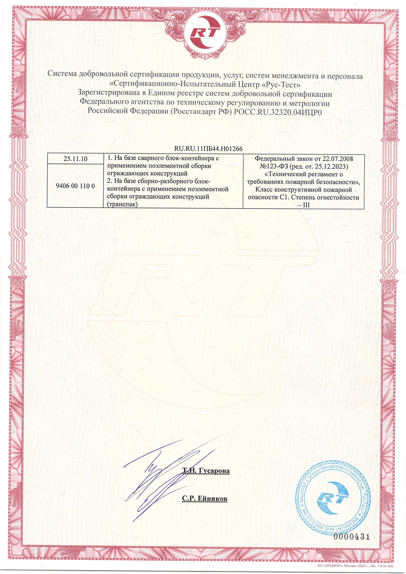 Цельносварной блок-контейнер полной заводской готовности обладает повышенной прочностью, поэтому допускается их установка в три этажа. Расчётный срок эксплуатации таких зданий благодаря применению качественных ЛКМ, оцинкованного профлиста, антисептированию и антипирированию всех деревоконструкций увеличен до 30 лет.